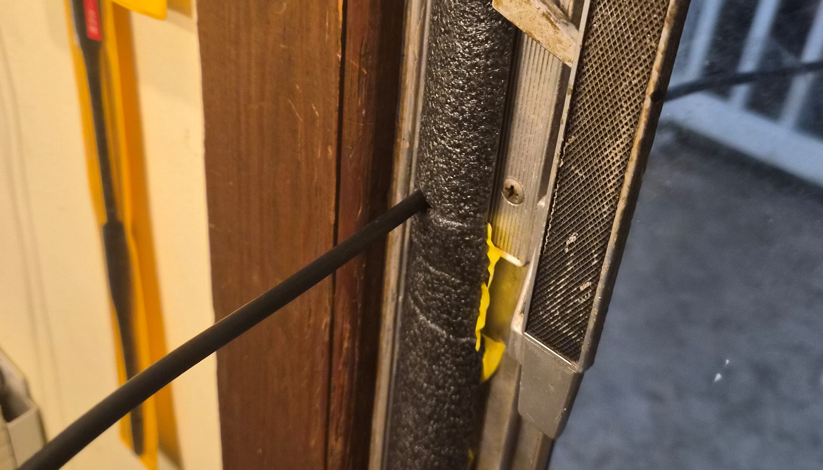 This is how I run the coax for the attena outside, I have some pipe insulation around the door where it closes so I can have the coax go outside but not let the cold air into the apartment. Also to help keep the seal tight (and security higher) I have a security bar that blocks the opening of the sliding glass door (also I have security a camra pointed at the parking lot, and 2 pointed to the back door from 2 diff angels, and a glass break senser that is connected to a ring security system, all are streamed to the cloud when any event happens)