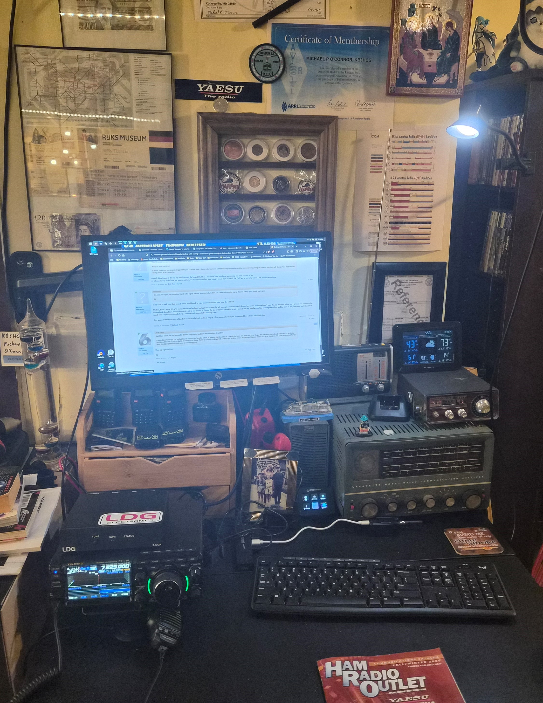 First here is my setup where I sit to operate the radio. You can see the ham computer I have setup, the ham radio and the tuner, and my late mothers old shortwave radio (a Lafayette, HA-63, I have it hooked up to a mag loop attena for short wave listening)